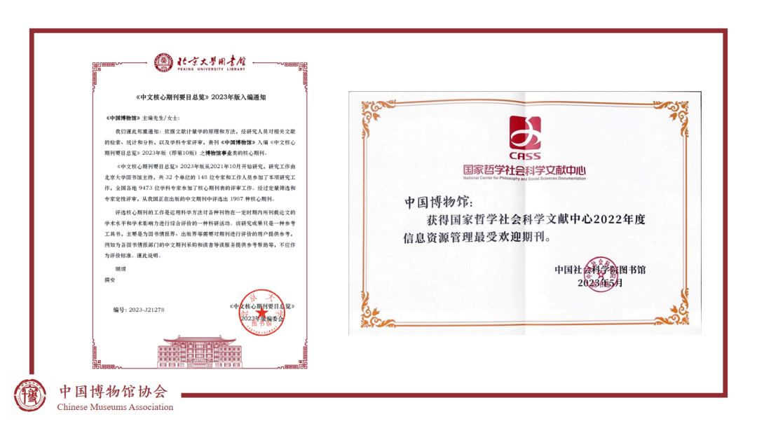 为更好顺应文化强国建设背景下中国博物馆事业的新形势、新发展,中国博协主办的《中国博物馆》2023年由黑白印刷改为全彩色印刷,期刊全年共6期,发表文章115篇,出版增刊《首届全国博物馆志愿服务典型案例汇编》,刊载文章85篇,正刊与增刊总计百余万字。期刊第三次入选《中文核心期刊要目总览》2023年版(即第10版)之博物馆事业类的核心期刊,同时连续三年获国家哲学社会科学文献中心2022年度信息资源管理“最受欢迎期刊”称号。